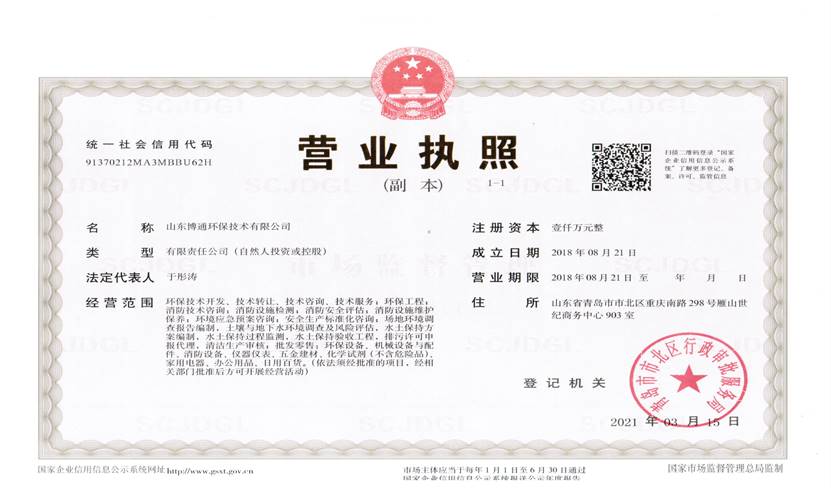 山東博通環(huán)保技術有限公司是一家專業(yè)從事環(huán)保、安全、消防的多元化技術服務公司,公司致力于打造專業(yè)的技術服務團隊,立足青島,輻射山東,服務范圍涵蓋:環(huán)保技術開發(fā)、技術轉(zhuǎn)讓、技術咨詢、技術服務;環(huán)保工程;消防技術咨詢;消防設施檢測;消防安全評估;消防設施維護保養(yǎng);環(huán)境應急預案咨詢;安全生產(chǎn)標準化咨詢;場地環(huán)境調(diào)查報告編制,土壤與地下水環(huán)境調(diào)查及風險評估,水土保持方案編制,水土保持過程監(jiān)測,水土保持驗收工程,排污許可申報代理,清潔生產(chǎn)審核;...
